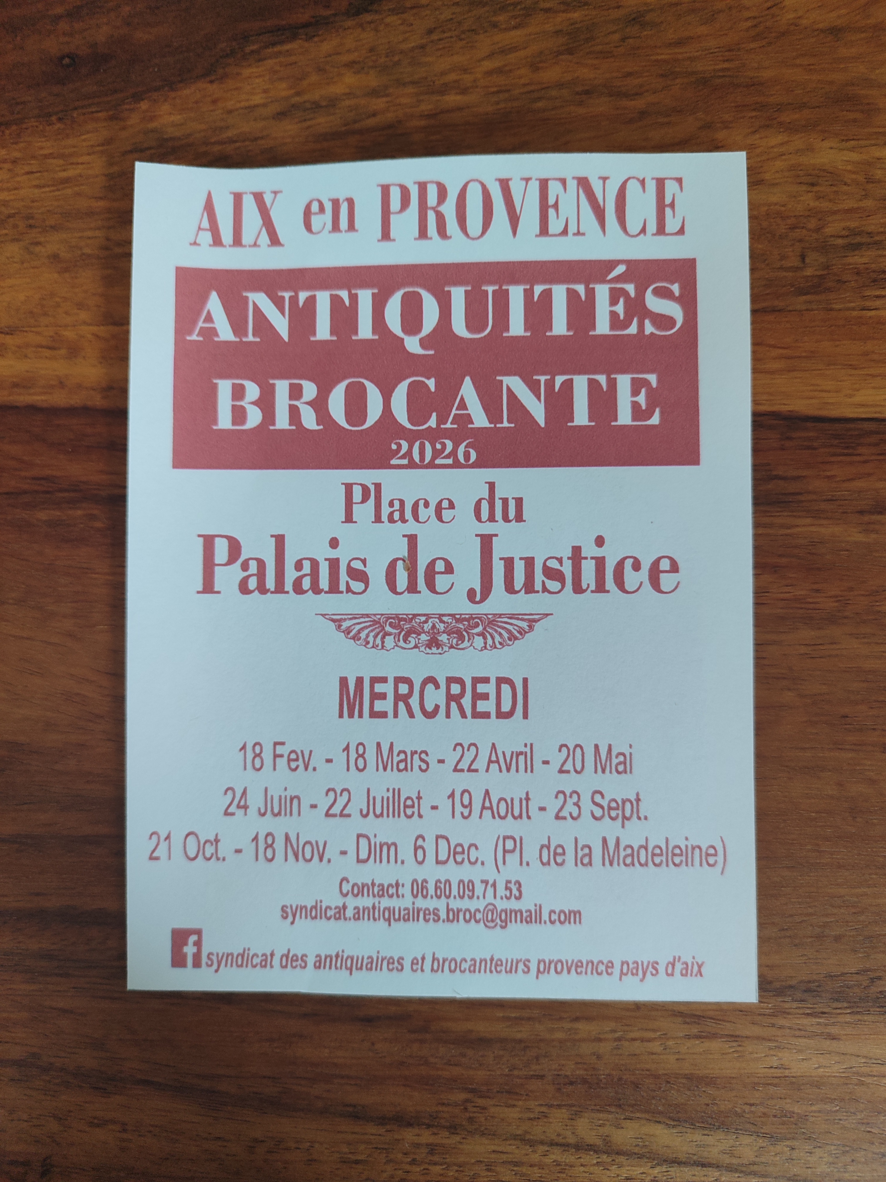 Une vingtaine de professionnels vous attendent chaque mois sur la Place du PALAIS de JUSTICE à AIX en PROVENCE pour vous présenter des pièces allant de l'antiquité classique au design du xxème siècle : mobiliers de toutes les époques, bijoux anciens, faïences, argenterie, tableaux, linge, verrerie .......