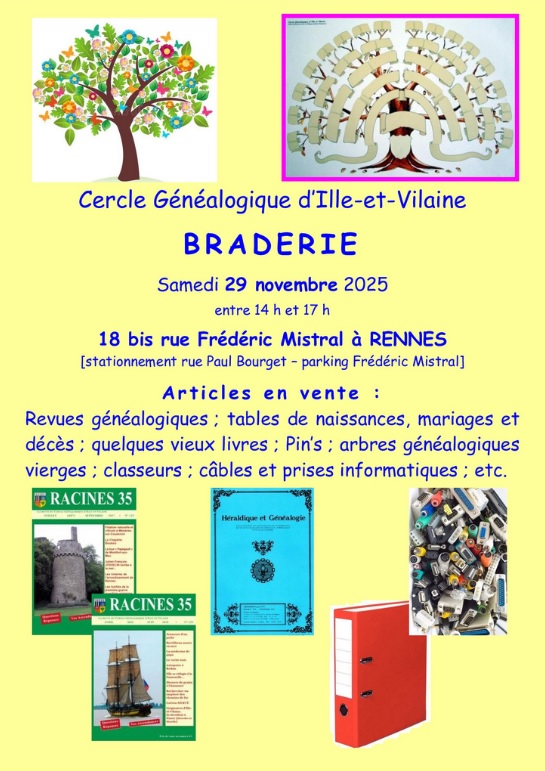 Vente de revues généalogiques : Racines 35, Revue Française de Généalogie, Généalogie Magazine, Héraldique et Généalogie, Mémoires de la Société généalogique canadienne-française ; tables de naissances, mariages et décès ; quelques vieux livres ; Pin's ; arbres généalogiques vierges et tableaux de travail ; grands classeurs ; câbles et prises informatiques ; etc.