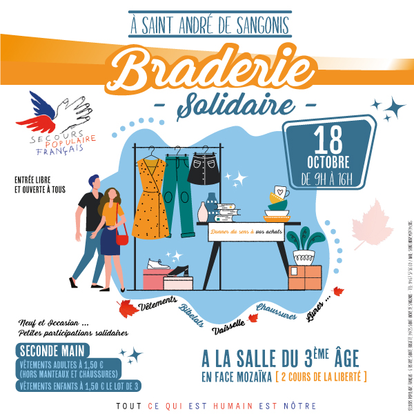 Les vêtements, jouets, livres, la vaisselle, bibelots et autres objets de seconde main seront à chiner contre une petite participation solidaire. A cette occasion : tous les vêtements d'occasion adultes sont à 1 € ; les vêtements d'occasion enfants sont à 1 € le lot de 5 ; Les chaussures sont à 2 € ; Tout le reste (déco, vaisselles, bibelots ...) sont à moitié prix. Les affaires neuves seront disponibles contre une petite participation solidaire. C'est un bon plan shopping au service de la solidarité à ne pas manquer et pour renouveler sa garde robe ou sa décoration intérieure à moindres coûts ! 100 % écoresponsable. Aucun sac ne sera distribué. Apportez vos cabas. Ouvert au grand public. L'ensemble des bénéfices serviront à financer les actions de solidarité de l'association en faveur des plus démunis de notre secteur.