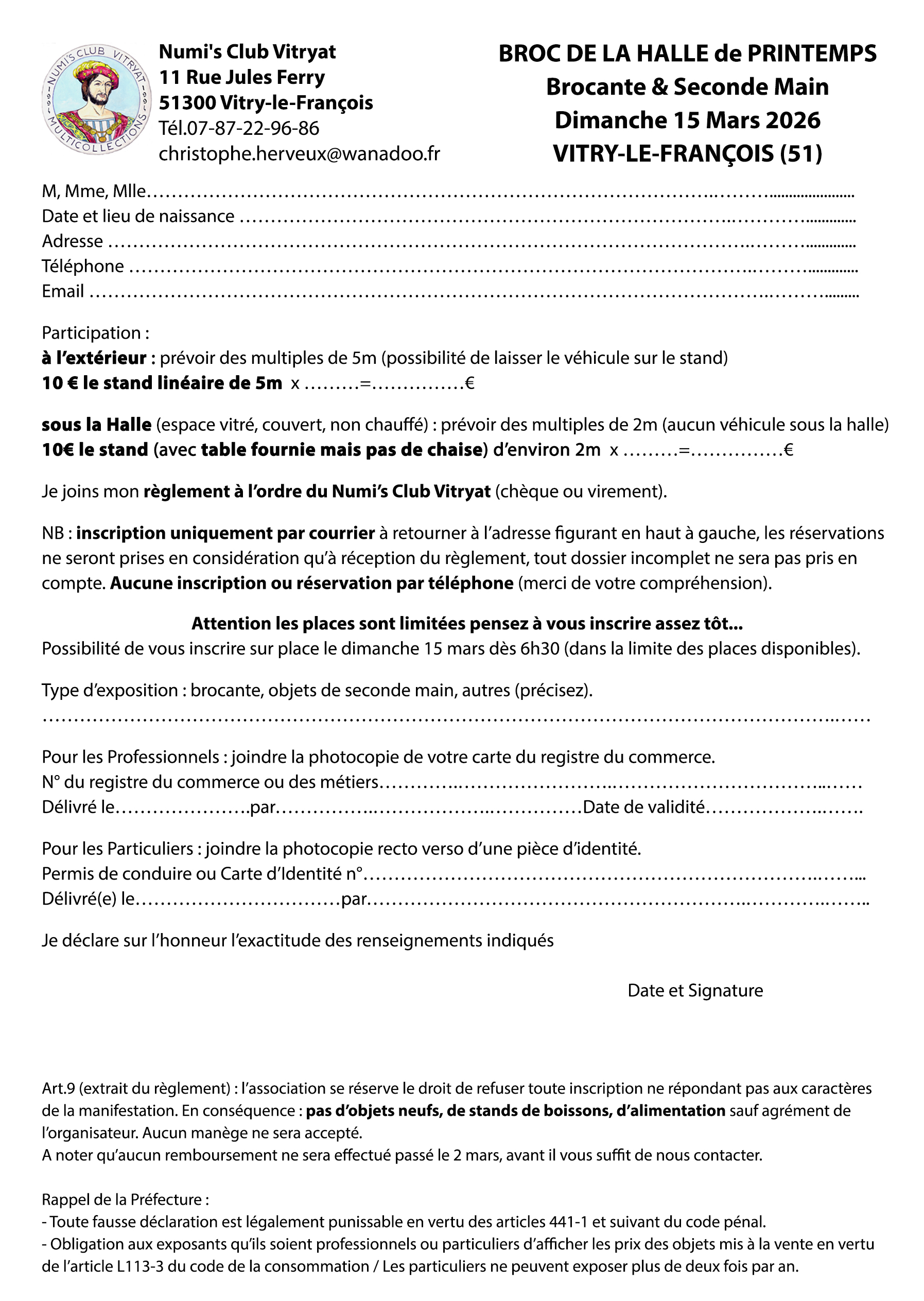 A l'extérieur 10€ le stand de 5m linéaire (possibilité de laisser le véhicule) / Places limitées