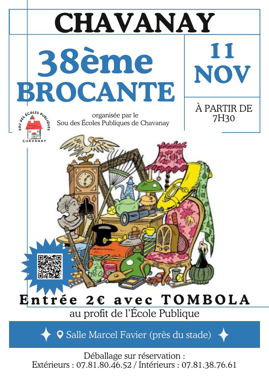 Venez exposer lors de notre 37ème édition de la Brocante de Chavanay, en intérieur (6€ le mètre linéaire) comme en extérieur (3€ le mètre linéaire). Vous trouverez toutes les informations nécessaires à l'inscription en contactant les organisateurs par téléphone et en prenant connaissance du bulletin qui vous sera transmis.