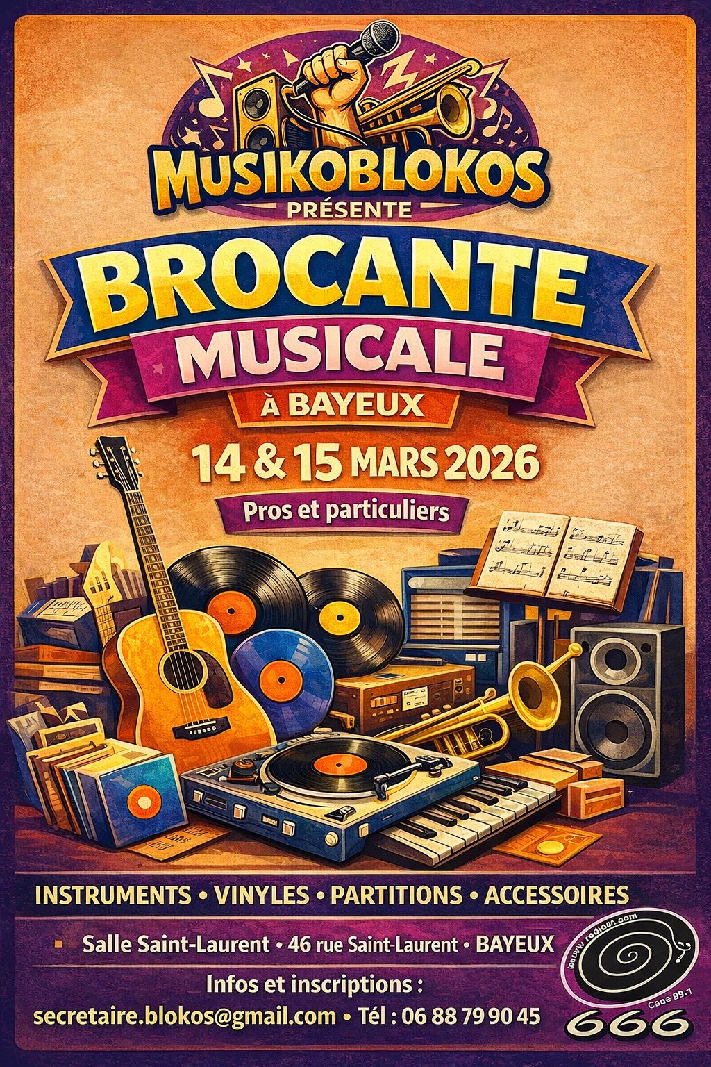 Accueil des exposants à 7h00 du matin. - Les inscriptions se feront à l’avance car la brocante est en intérieur et le nombre de places est limité. Merci de nous contacter avant de vous déplacer. - Tarification: 3 € le mètre pour une journée. Deux journées sont dédiées à cet évènement. bulletin d'inscription disponible sur le site de l'association, https://musikoblokos.lovable.app/ rubrique brocante musicale