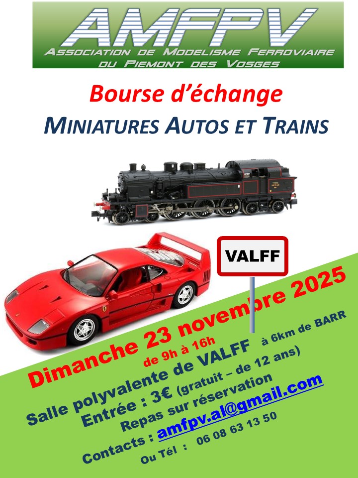 Amateurs de miniatures Autos et Trains, rendez-vous à la salle polyvalente de VALFF le 23 novembre prochain.