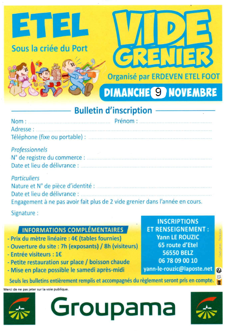 le club de football erdeven etel organise son troc et puce annuel à la criée d'etel, le 09/11.