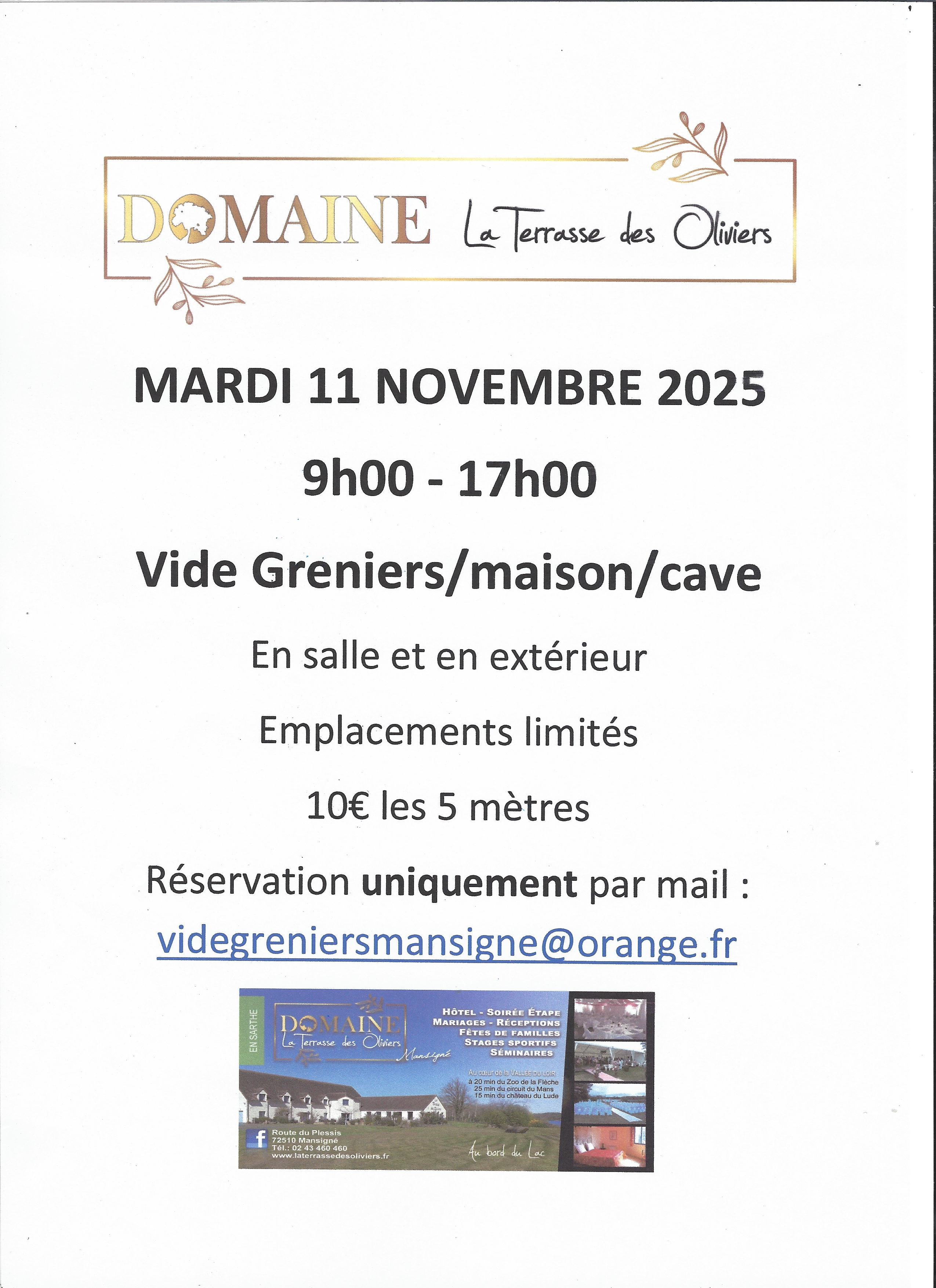 Entre 7h30 et 9h00 le 11 novembre videgreniersmansigne@orange.fr