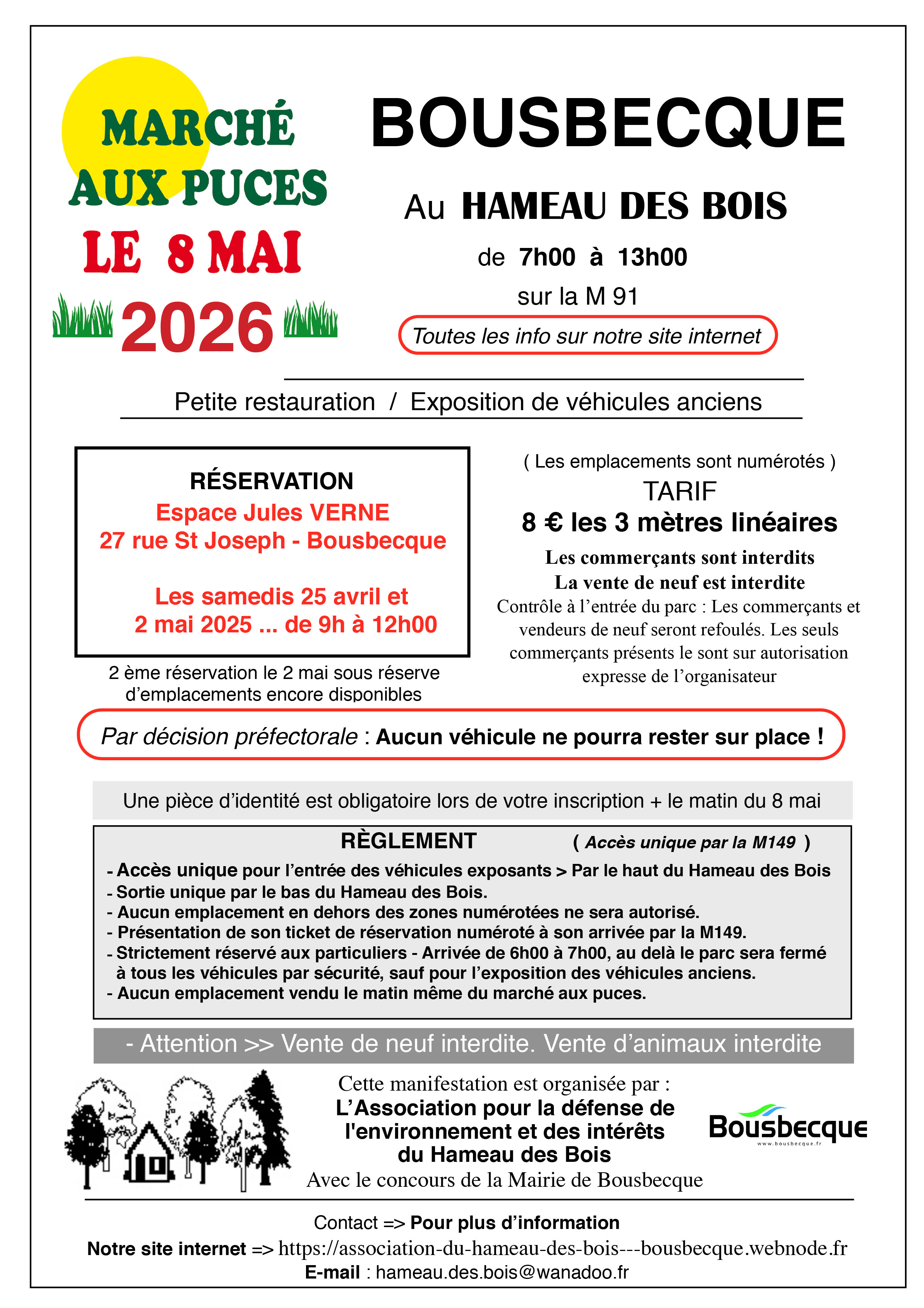 Inscription exposant les 27 et 2 mai de 9h00 à 12h00 à l'Espace Jules VERNE - 27 rue Saint Joseph à Bousbecque - Déballage de 6h00 à 7h00 - Emplacements numérotés - Commerçants strictement interdits => Toutes les informations pratiques sont sur notre site internet. https://association-du-hameau-des-bois---bousbecque.webnode.fr/?_gl=1*corea2*_gcl_au*MTIwMTgxNzAwNC4xNzM4ODM1MzAz