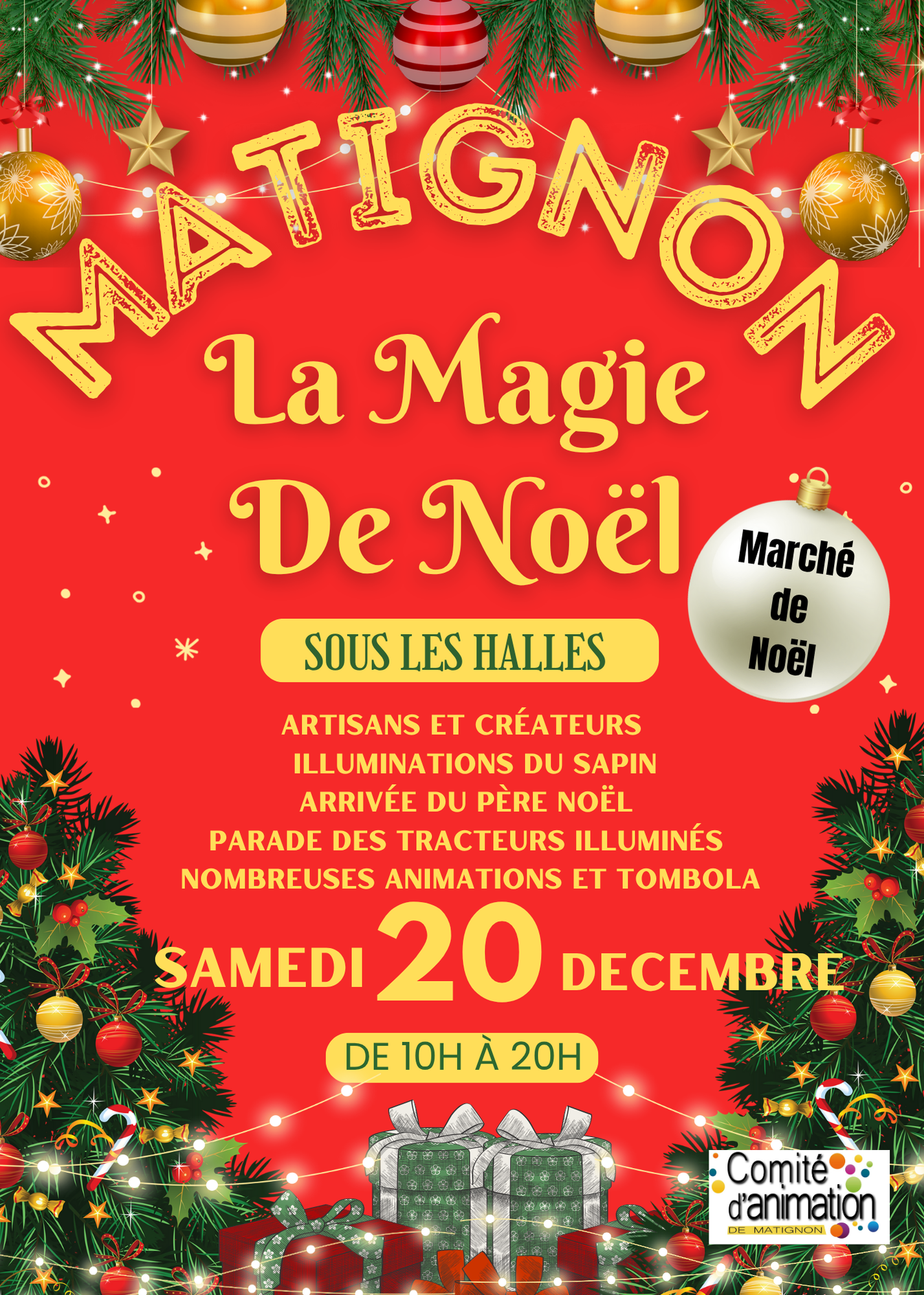 Arbre de Noël. Rendez-vous en famille et entre amis pour célébrer la magie de Noël : Marché avec des créateurs, artisans pour vos cadeaux, vin et chocolat chauds, crêpes, manège pour les enfants, arrivée du Père Noël, parade des tracteurs décorés et illuminations du bourg. Samedi 20 décembre de 10 h à 20 h, sous les halles, place du Général-de-Gaulle, Matignon. Gratuit. Contact : 06 81 45 75 55, 06 12 57 94 89, comiteanimationmatignon22@gmail.com.