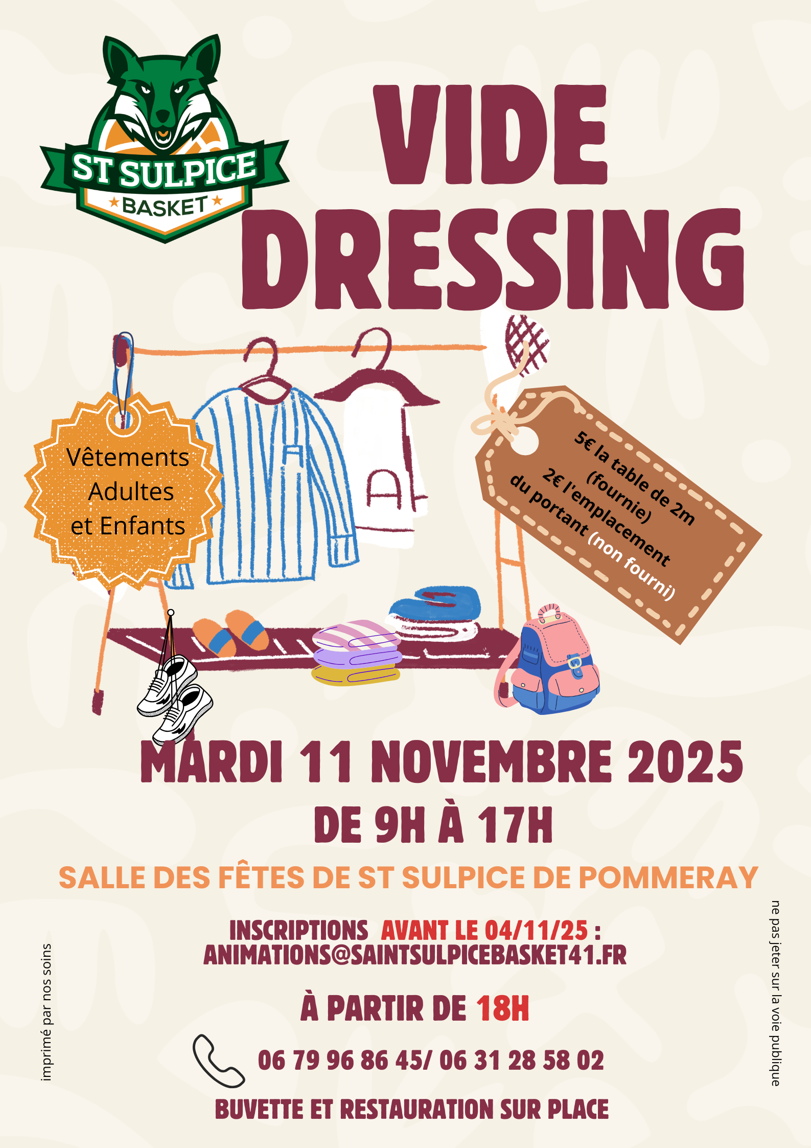 5 € la table de 2 m fournie, 2 € l'emplacement du portant non fourni