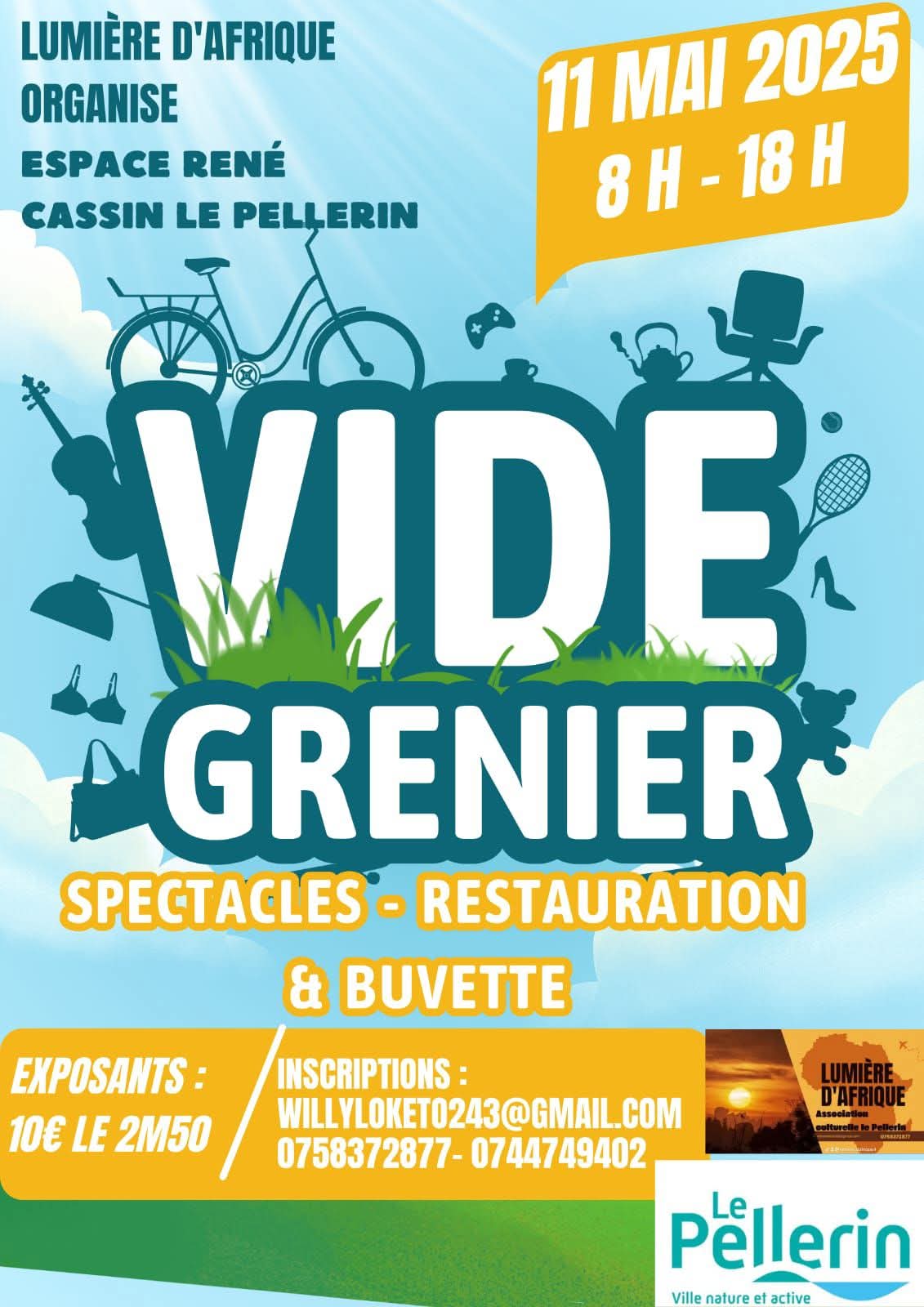 Association Lumière d'Afrique de Pellerin organise un grand vide grenier le 11 mai à l'espace René Cassin 1 boulevard jean Monnet 44640 Pellerin pour tout renseignement n'hésitez pas à nous contacter...
