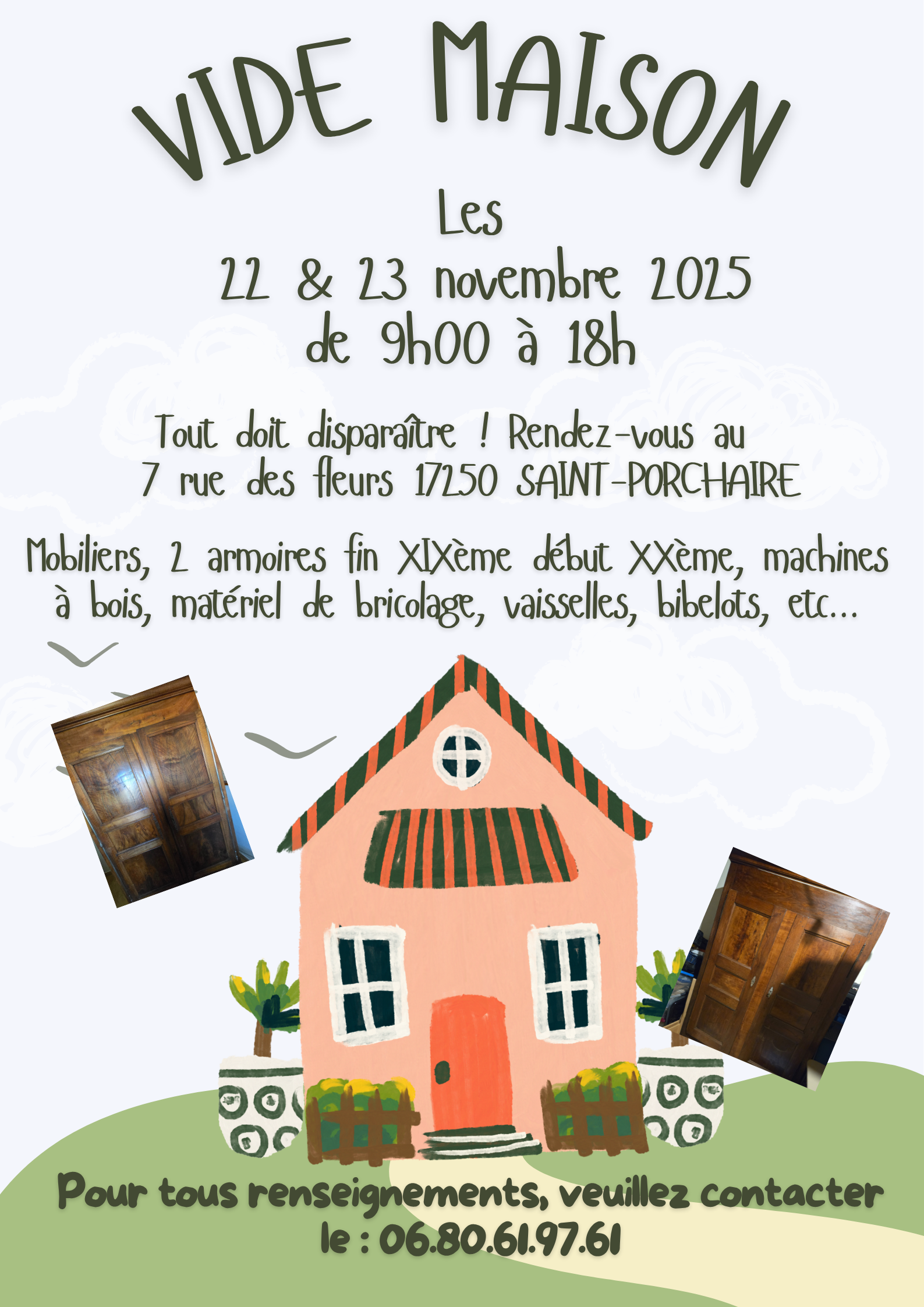 Suite à décès, mes frères et sœurs, organisons un vide maison les 22 et 23 novembre 2025 avant la vente de celle-ci. Des machines à bois, meubles dont une chambre à coucher, deux armoires anciennes (fin XIX° début XX°), une comtoise, un vaisselier, de la vaisselle (pour certaine provenant de Djibouti), verres, vêtements homme taille M et L, bijoux, etc...